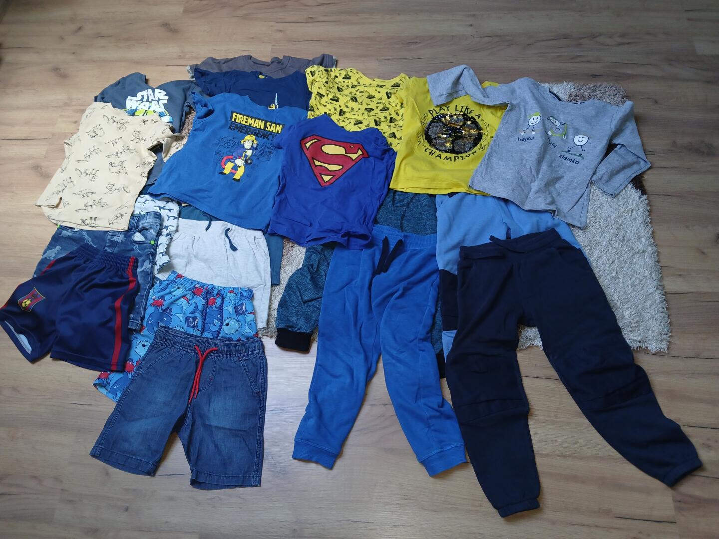Sprzedam 4 pary spodni, 7 par spodenek, 3 cienkie bluzki oraz 6 koszulek. Ubrania w rozmiarze 110-116. Stan bardzo dobry i dobry.